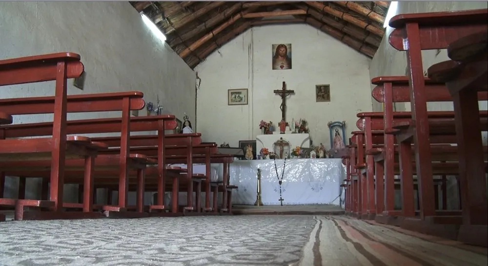 Primitiva madera barnizada de los bancos propone un descanso para encontrarnos con nosotros en esa inmensidad donde reinan con simpleza el guanaco y la vizcacha. El rezo escala el infinito en piropos de zorzales y corona las cumbres. Un Cristo pequeño nos mira, nos aguarda en el fondo del saloncito.