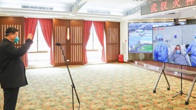 El presidente chino Xi Jinping habla por video con enfermos y trabajadores de la salud en el hospital Huoshenshan en Wuhan, provincia de Hubei.