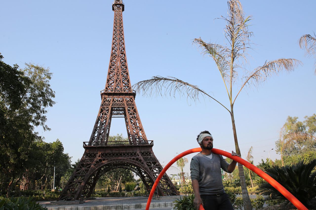 El proyecto empezó en septiembre, pero era la época del monzón en Delhi de modo que hubo problemas porque este sitio es también un vertedero, debajo de este suelo hay todo tipo de materiales descartados. Con el paso de las semanas el equipo de trabajo logró sortear estos obstáculos y a finales del pasado enero las estructuras estaban listas, a falta de finiquitar algún que otro detalle como la iluminación, para que los monumentos "brillen” en la noche. Las piezas, la más corta siendo el Coliseo con unos 5 metros de altura (16 metros de diámetro) y la más alta la Torre Eiffel con cerca de 21 metros, están diseminadas por un parque con subidas y bajadas, muchos árboles, fuentes, y caminos con un coste de algo más de un millón de dólares. "Cuando estás viendo un monumento no deberías ver otro monumento, te concentrarás sólo en esa estructura. No debe haber ninguna distracción y es por ello que creamos suelos empinados y plantamos árboles de forma que tape las otras cosas", concluyó Singh.