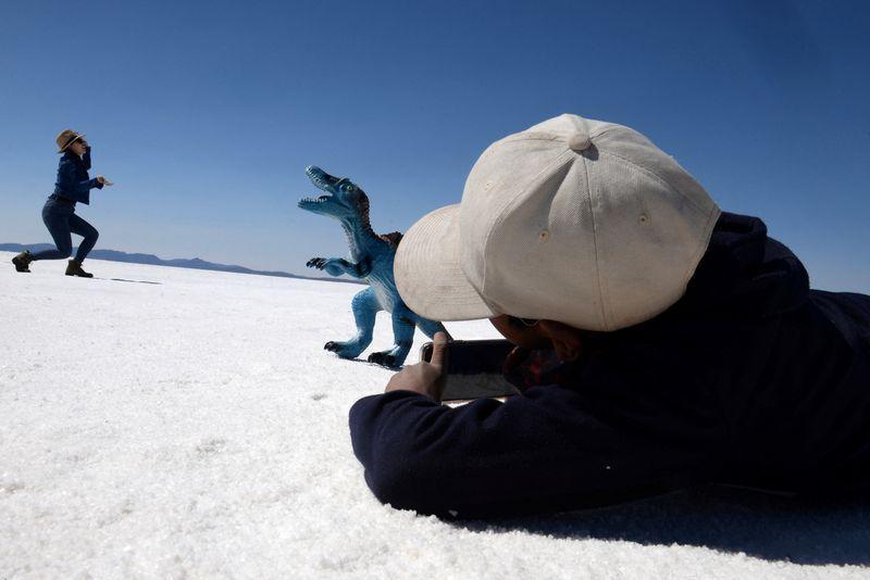 Es que allí, en las salinas blancas del Salar de Uyuni en Bolivia, el pequeño de 11 años se ha convertido en una sensación por las fotografías extravagantes y creativas que toma a los turistas con la ayuda de un dinosaurio de juguete de plástico azul.
