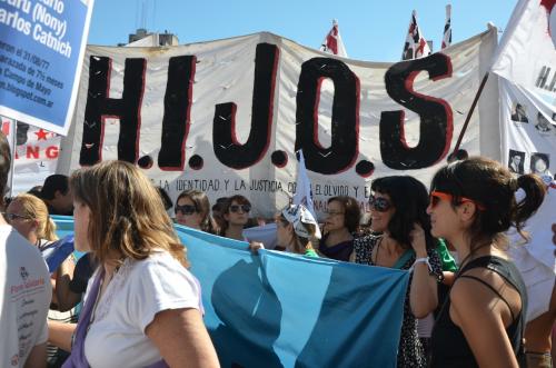 Entre otras agrupaciones defensoras de los Derechos Humanos a mediados de la década del noventa nacía "Hijos por la Identidad, por la Justicia, contra el Olvido y el Silencio" (HIJOS). Este grupo de jóvenes, que tienen en común en sus historias personales la ausencia de uno de sus padres, en algunos casos, o ambos en otros, deciden unirse al reclamo social, la denuncia y el pedido de justicia. Oficialmente nacen en la provincia de Córdoba en abril de 1995, transformándose, de la mano de Madres y Abuelas de Plaza de Mayo, en una voz contundente en el reclamo de derechos desde sus comienzos.