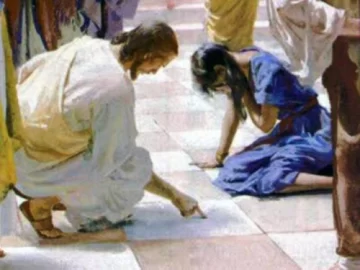Los escribas y los fariseos le trajeron a Jesús una mujer que había sido sorprendida en adulterio y, poniéndola en medio de todos, le dijeron: ‘Maestro, esta mujer ha sido sorprendida en flagrante adulterio. Moisés, en la Ley, nos ordenó apedrear a esta clase de mujeres. Y tú, ¿qué dices?”. Pero Jesús, inclinándose, comenzó a escribir en el suelo con el dedo. Como insistían, se enderezó y les dijo: ‘El que no tenga pecado, que arroje la primera piedra”. Al oír esto, todos se retiraron, uno tras otro, comenzando por los más ancianos. Jesús quedó solo con la mujer y le preguntó: ‘Mujer, ¿dónde están tus acusadores? ¿Alguien te ha condenado?” Ella le respondió: ‘Nadie, Señor” ‘Yo tampoco te condeno, le dijo Jesús. Vete, no peques más en adelante” (Jn 8,1-11)