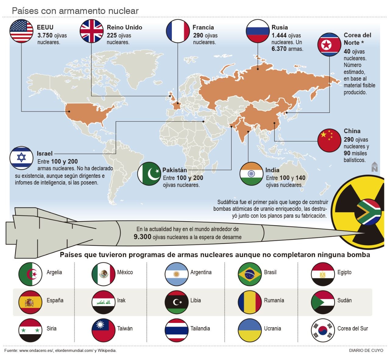 La ONU (Organización de las Naciones Unidas) asegura que en el mundo hay actualmente 13.400 armas nucleares. Corea del Norte es el último país que habría desarrollado este recurso en un proceso que le llevó varios años y que terminó recientemente con la declaración de ser un "Estado con armas nucleares", tal como lo anunció el líder coreano Kim Jong Un.