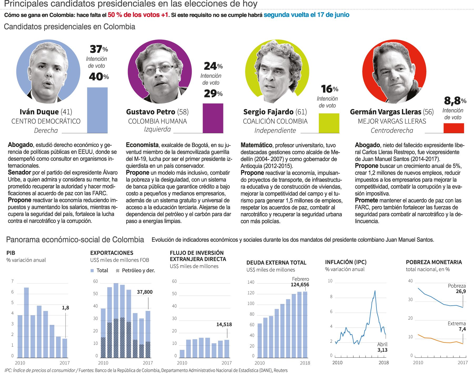 El presidente Juan Manuel Santos llega devaluado y con muy poco consenso. Germán Vargas Llera, exvicepresidente y candidato oficialista, marcha cuarto, según sondeos preliminares, quedando fuera de una potencial segunda vuelta, por lo que quedan únicamente dos fuerzas en pugna con posibilidades de llegar a la presidencia de Colombia.