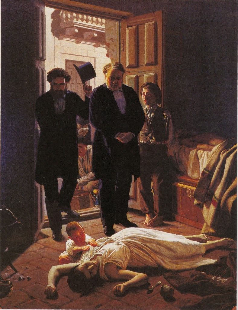 Vi el cuadro cuando era niña en la Casa Natal de Sarmiento. Quedé fuertemente impresionada por la pintura. La obra "Un episodio de la fiebre amarilla en Buenos Aires" pertenece al pintor uruguayo Juan Manuel Blanes (1830-1901). Con los años he sentido idéntica impresión ante el retrato, síntesis acabada de una tragedia. La pintura describe una escena de esta epidemia, donde se advierte el delgado hilo que separa la vida de la muerte. Junto al cadáver de la madre, víctima de fiebre amarilla, está su pequeño hijo prendido a su pecho. La fragilidad humana y el intento de sobrevivir quedaron plasmados en la obra. Y aquello, realmente fue una tragedia. La fiebre amarilla llenó de desolación y muerte a Buenos Aires: en 1871, cerca de 14.000 personas fallecieron víctimas de la misma.