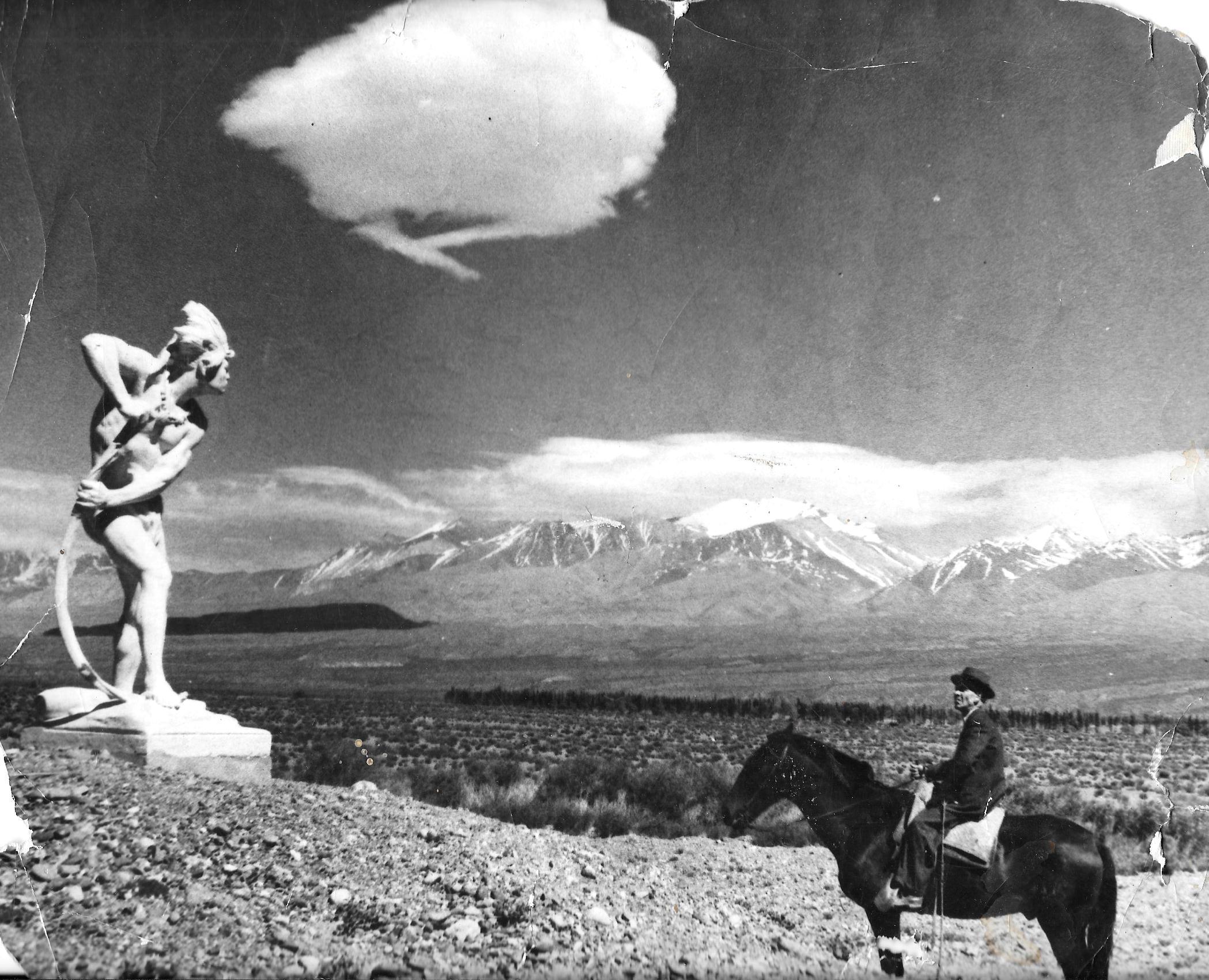 El Caupolicán fue un líder mapuche en la resistencia del pueblo originario contra los conquistadores españoles que invadieron Chile durante el siglo XVI. Luchó desde su juventud contra los invasores por la libertad de su pueblo. Fue elegido "toqui", jefe militar de los mapuches, siendo sucesor de Lautaro. Era miembro de una familia muy respetada en esa sociedad. El Caupolicán era un varón de autoridad grave y severa, duro y decidido, firme para mantener sus opiniones y llevar a cabo sus empresas. Había nacido tuerto. Ese defecto le daba a su cara un aspecto feroz y no era desmedro para su habilidad física. Murió asesinado por los españoles, por perforación intestinal o empalamiento, muerte terrible, dolorosa y delante de toda su gente. Para Chile, este cacique significó mucho por su valentía, por su lucha en la liberación de los sometimientos españoles, que nunca consiguieron. El escultor Nicanor Plaza (de reconocimiento mundial) esculpió una estatua de bronce de 3.30 metros de altura, que fue ubicada en el cerro Santa Lucía, en Santiago de Chile. Allá por el año 1943, mi padre, de feliz memoria, retrató en Barreal, Calingasta, una réplica de esta estatua del Caupolicán realizada en mármol blanco de singular belleza y perfección, que fuera obsequio de la República de Chile a nuestra provincia. Según dicen, la misma fue destruida por unos baqueanos del lugar, que nunca se supo a ciencia cierta, si fueron mandados, por lo que la estatura significaba, porque existía un rechazo por parte de los criollos-españoles a la lucha de los aborígenes, o fue "guardada" (nunca se encontraron restos) por un afincado o poderoso de la época. No se tiene con certeza la historia del porqué llegó a San Juan esta estatua. Hay varias versiones, que al igual que los portones del Parque de Mayo, "desaparecieron". Estas tomas fotográfica únicas que hizo José Mazuelos (mi padre), es lo único que existe del Caupolicán. Esta fotografía obtuvo el primer premio en un concurso fotográfico en el "Cuarto Salón Anual de Arte Fotográfico", en la Biblioteca Sarmiento, Tres Arroyo, en junio de 1943, por su arte y belleza del paisaje sanjuanino.