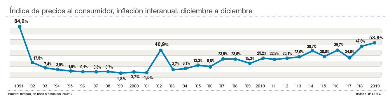 Se dice que estamos afrontando la tasa de inflación más alta desde 1991, porque en esa fecha, después de dos procesos hiperinflacionarios, el índice de precios llegó al 84% y luego fue bajando paulatinamente hasta incrementarse nuevamente durante 2019.