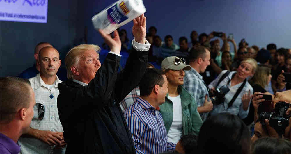 Hubo muchos síntomas de negligencia, desorganización e ineptitud de Trump en su respuesta al huracán María. Mientras que visitó Texas sólo 4 días después del huracán Harvey y viajó a Florida apenas 4 días después del huracán Irma. Sin embargo tardó 13 días en llegar a Puerto Rico, después de que María golpeara la isla. En este marco se dieron las críticas de Trump a los jugadores de la NFL que se habían arrodillado en señal de protesta durante el himno estadounidense y la escena en la que lanzó, en broma, rollos de papel toalla a las víctimas del huracán. Muchos puertorriqueños lo tomaron como ofensivo en un momento en que mucha gente moría por falta de electricidad en los hospitales.