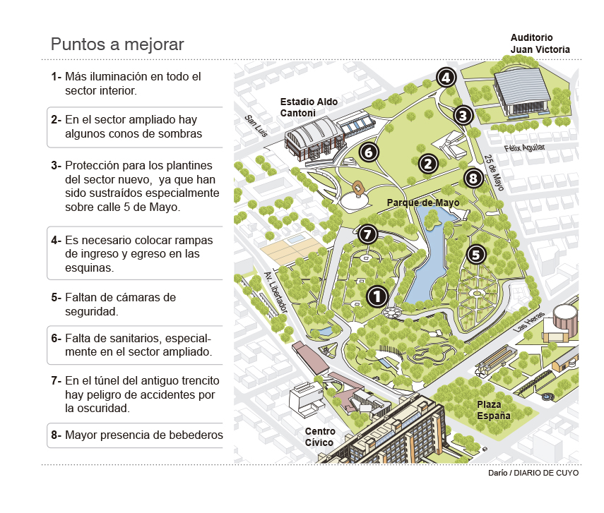 El denominado eje Cívico – Cultural – Recreativo es una obra aprobada por los sanjuaninos. Esto se puede notar al ver la concurrencia a los distintos sitios creados o refaccionados como paseos públicos que forman parte de esta temática. Son miles las personas, entre niños, jóvenes y familias, que llegan a toda hora para disfrutar de los nuevos espacios en el Parque de Mayo, Plaza del Bicentenario el paseo del Centro Tecnológico Educativo "Infinito por Descubrir” y demás espacios adyacentes. Cabe recordar que las obras todavía no se terminan, según información oficial. Sin embargo, este diario, luego de un relevamiento en la zona y un sondeo entre los transeúntes, llegó a la conclusión de que la población en general aprueba estos nuevos lugares y señala distintos aspectos que le hacen falta para que sea una obra completa. En ese sentido, los detalles a tener en cuenta en la obra fina de este eje son: rampas de ingreso y egreso en la zona donde estaba el velódromo y donde haga falta. También mayor iluminación con tecnología led en el Parque de Mayo, como también reflectores que bañen de luz toda la zona. Otra de las propuestas de los lectores es la colocación de más sanitarios en la zona, donde la gente no sólo va a descansar y recrearse, sino que hace caminatas y entrenamientos. También multiplicar los bebederos; emparejar el terreno en la parte nueva que limitan con la avenida 25 de Mayo y Urquiza, debido a que se forman lagunas cuando se riega. Los sanjuaninos también están pendientes de la seguridad, por eso, más allá de la presencia policial, piden cámaras de vigilancia en la zona y control antivándalos.