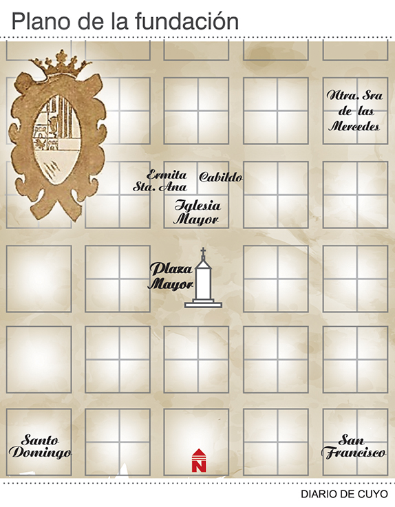 Es una copia del plano primitivo de la ciudad fundacional obtenida en el Archivo General de Indias (España). Representa los espacios próximos a la actual Plaza de Concepción, al norte de la actual Plaza 25 de Mayo. Los españoles trajeron a América el plano en cuadrícula o en damero y la ciudad de San Juan de la Frontera no fue la excepción. Se caracteriza por su trazado sencillo en damero, retícula o en cuadrícula, edificación de escasa altura, con una Plaza Mayor donde se ubican los edificios públicos y se concentran los poderes: Catedral y Cabildo. "El trazado de la ciudad respondía a un modelo establecido por las Leyes de Indias, por la Real Cédula de Poblaciones de 1523 y la Ordenanza de Poblaciones de 1573. El orden de la ciudad está dado por una retícula viaria como red o cuadrícula regular ortogonal, que concentraba manzanas de figuras semejantes al cuadrado. El ejido se limita al damero central de 5×5 manzanas, alrededor de la Plaza de Armas, donde se plantó el rollo de la Justicia como símbolo de la Fundación".