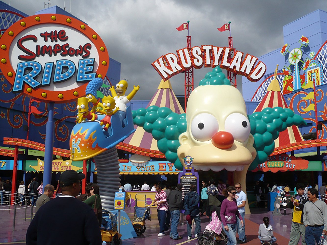 La atracción es más grande que el tamaño real: desde el payaso Krusty de 9,6 m a la entrada (los visitantes caminan por la boca de Krusty, sobre su lengua extendida) hasta la gigantesca experiencia cinemática envolvente…”.