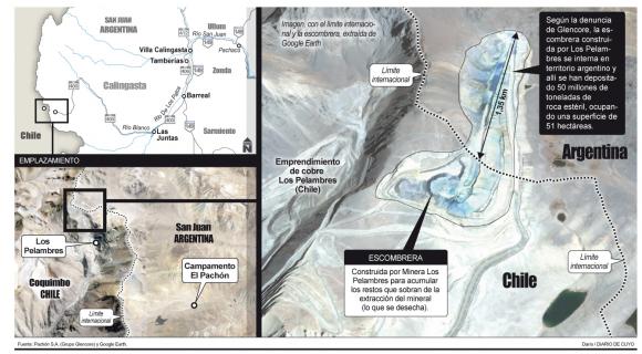 En ese escenario, Glencore ha sumado otro condimento que acarrea interesantes y alarmantes puntos para analizar: en noviembre del año pasado la compañía presentó una demanda en el juzgado Federal de San Juan que dirige Miguel Ángel Gálvez contra Minera Los Pelambres, de Chile, al asegurar que los chilenos habían armado una escombrera de unas 50 millones de toneladas de roca estéril del lado argentino, en territorio de El Pachón (ver infografía). Para saber de quién se habla, hay que aclarar que Minera Los Pelambres está compuesta en un 60% por Antofagasta Minerals y en un 40% por un consorcio de empresas japonesas integrado por Nippon LP Investment y Marubeni& Mitsubishi LP Holding BV y opera en Coquimbo desde 1999. Según publicó en diciembre o enero el diario chileno El Mercurio (nota que replicó el Nuevo Diario de San Juan hace un par de semanas), los chilenos dijeron que habían depositado ese material en la zona porque los límites internacionales no estaban claros al momento de armar la escombrera. Glencore, consultada por DIARIO DE CUYO, respondió a través de un comunicado que ‘La única realidad es que el límite entre la Argentina y Chile fue fijado por ambos países mediante el Tratado de 1881, y que en la zona que nos ocupa dicho límite no ha estado en disputa ni ha sido modificado desde entonces. Las autoridades de límites de ambos países han ratificado lo aquí expuesto’. En el mismo texto, aparecen algunas frases que preocupan: ‘Basta remitirse a documentos públicos emitidos por Minera Los Pelambres, para conocer que el material depositado allí por dicha empresa tiene la capacidad, con el tiempo, bajo determinadas condiciones y habiendo sido abandonado por Pelambres, de generación de ácido de roca, por lo que Pelambres debe retirar dicha escombrera de la propiedad de Pachón y de territorio argentino a la mayor brevedad. La negativa a hacerlo en la que se mantiene inexplicablemente, únicamente agravará su responsabilidad. Otros daños, atento -por ejemplo- que el suelo y la pendiente de aguas en la zona han sido alterados por Minera Los Pelambres, están siendo evaluados. Además de escombros Pelambres ha depositado en la escombrera centenares de neumáticos usados de equipos mineros en una práctica que está prohibida por ley. Sabiendo Pelambres que esos neumáticos están en Argentina y que ello no es una práctica legal en nuestro país, no ha hecho nada para remediarlo’. En pocas palabras, dicen que la acción chilena "puede provocar" ácido de roca, no que efectivamente ha ocurrido, dejando un final abierto y miles de millones de conjeturas. ¿Qué es el ácido de roca? Es el agua que termina contaminada con los minerales que contienen las rocas que están en los ríos. En Jáchal, por ejemplo, el agua del río Salado se llena del boro y el arsénico que hay en la zona por donde pasa ese río. Y esa acción termina por convertir en no potable el líquido. En el caso de El Pachón, el agua de deshielo o las lluvias podrían convertirse en ácido al rozar las rocas que, según la denuncia de Glencore, han arrojado los chilenos en el lado sanjuanino. Pero no lo aseguran, lo sugieren, dicen que eso puede ocurrir, y no que ocurre. Actualmente, el Instituto de Investigaciones Hidráulicas de la Universidad Nacional de San Juan, que hace estudios desde hace 15 años en el proyecto, continúa monitoreando la salubridad del agua en los 7 cursos de agua de influencia de El Pachón, sobre 90 puntos de monitoreo, entre superficiales y subterráneos. Si los niveles fueran más altos de lo normal, es de seguro que la UNSJ lo hubiese comunicado. Este diario repreguntó respecto de la contaminación y, también, si eso condicionaba la inversión en Argentina, pero no contestaron. Ese vacío de respuestas dispara preguntas: ¿hay alguna maniobra escondida en la publicidad de la demanda? o ¿porqué anunciar algo que no saben si podrán hacerlo? Porque si hay escombros que se interponen en la construcción del proyecto, es evidente que no podrán llevar adelante la construcción de El Pachón. O, de querer hacerlo igual, ¿ellos asumirán los costos de remover 50 millones de toneladas?