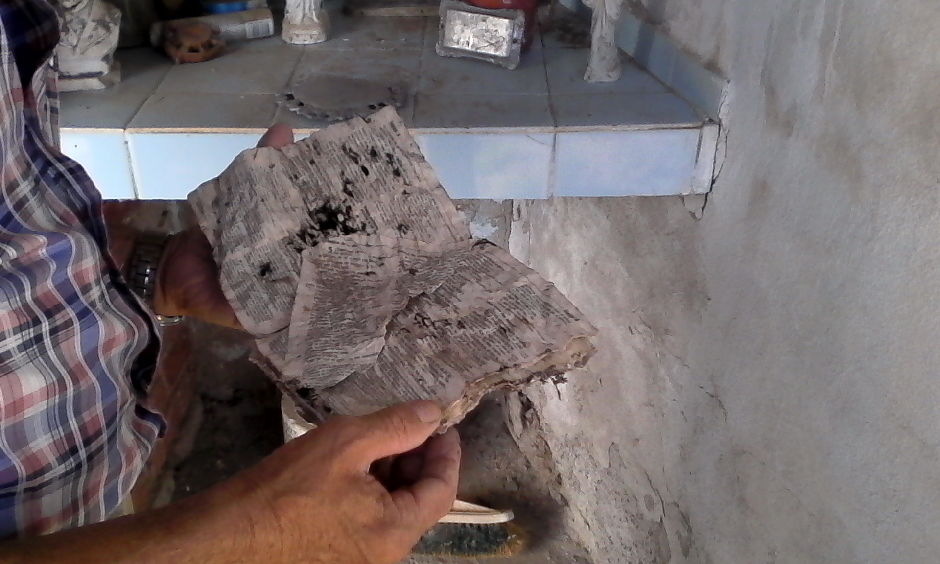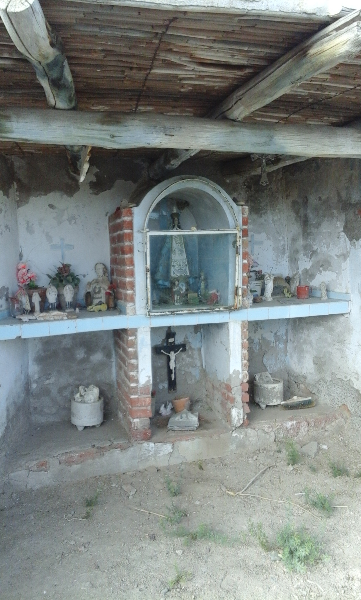 Al llegar estacionamos y caminamos unos 200 metros, por el mal estado del camino. El paisaje comenzó a tornarse seco, el verde majestuoso se convirtió en chañares, espinas, y pastos duros. El viento se detuvo, comenzó a subir la temperatura. De pronto sentimos los gritos de una mujer, Camilo y yo nos miramos a los ojos horrorizados por los gritos. Continuamos nuestra marcha y esta vez los cables de alta tensión emitían sonidos similares a los cerdos cuando los están por carnear. Continuamos un poco más, aturdidos. De pronto diviso entre los chañares una construcción que para ser una casa era muy baja. Observamos el altar y la imagen de la Virgen intactas, pero a las imágenes de los santos les habían cortado las cabezas (foto). Además estaban los elementos de un ataúd como el crucifijo, chapa identificadora con el nombre del fallecido que, casualmente era conocido de Camilo. Ante este escenario, nos sentíamos mal y queríamos salir de allí lo más urgente posible.