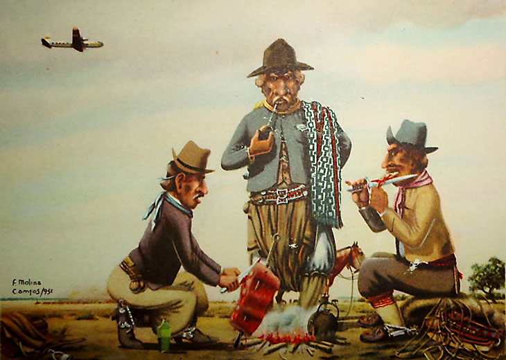 Marcelo T. de Alvear fue su promotor. Impresionado por la obra de Molina Campos, lo nombró profesor del Colegio Nacional de Avellaneda. Era un momento dorado de la cultura nacional. Güiraldes publicaba "Don Segundo Sombra", y Roberto Arlt "Juguete rabioso". Horacio Quiroga escribió "Los desterrados" y aparecía este joven que retrataba paisanos con un humor casi inocente. Su obra culmina con la publicación del almanaque de Alpargatas, en 1931, cuando sus retratos campestres se hacen accesibles al gran público. No hay almacén, ni estancia donde falten las imágenes de esos gauchos llevando adelante tareas rurales o simplemente, aprovechando para descansar la osamenta del diario trajinar.