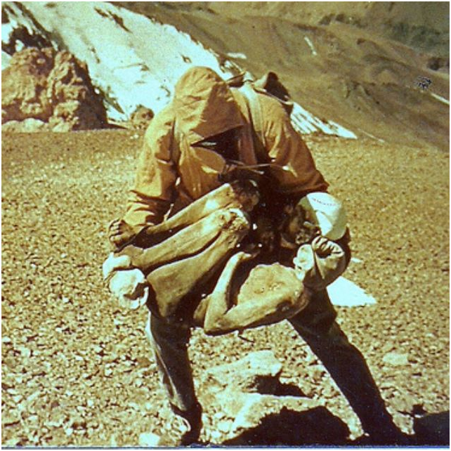 Tras días de trabajo el grupo logró ascender hasta los 5.000 metros, por lo que aún restaban más de 1.700 para hacer cumbre. En ese momento Oscar Kummel se descompuso y Sergio Fernández tuvo que bajar con él hasta el campamento base para que pudieran ayudarlo. De esta manera sólo quedaron Edgardo y Antonio en esta exigente misión.