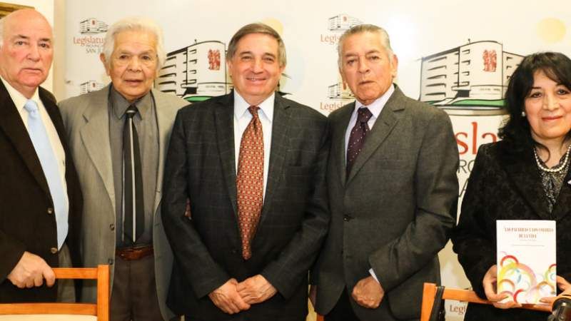 Temiño, Quinteros e Yribarren (fallecido) en la presentación del libro "Las palabras y los colores de la vida", editado en 2015 por "Cielo Raso" y la Municipalidad de la Capital. Acompañan Meglioli y otras autoridades.