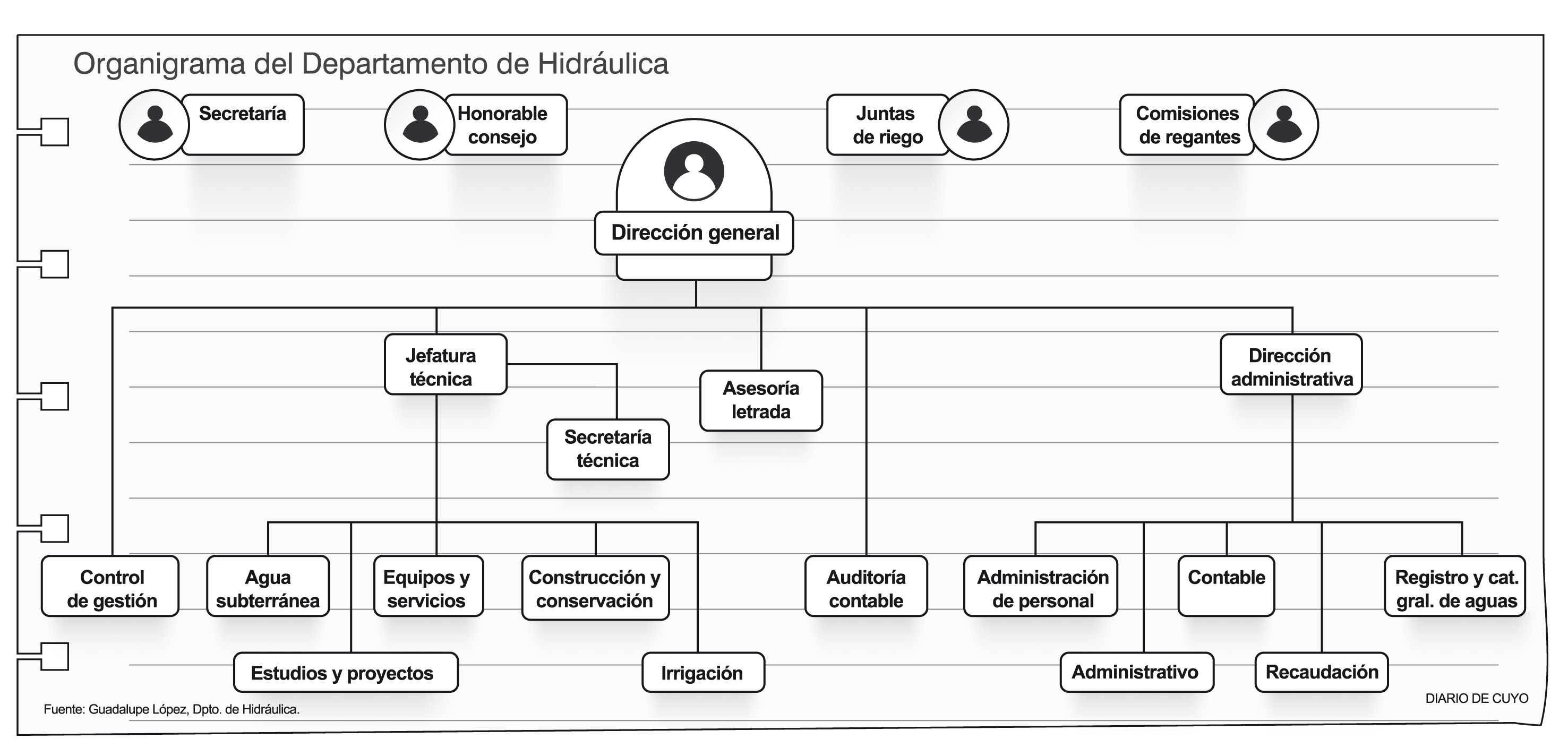 Respecto del organigrama de la repartición (Ver infografía), hay un esquema básico que no se está cubriendo en la forma en que está funcionando actualmente, ya que hay algunos cargos con personal de planta y también contratados. Actualmente el Departamento de Hidráulica tiene 318 agentes en planta permanente y 170 contratados, entre los que figuran las últimas incorporaciones de personal profesional. En total son 488 agentes entre personal administrativo, inspectores técnicos (uno por cada delegación departamental), llaveros generales y celadores que tienen a su cargo tanto tareas de distribución como de mantenimiento de la red de riego.