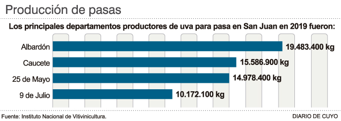 Según datos estadísticos del INV, sólo el 3,5% de los 2.519.886.200 kilogramos totales cosechados el año pasado para todos los destinos como vino, mosto y uva en fresco; fue a pasa de uva. Esto es que 87.749.900 kilogramos de uva totales cosechados en el país fueron desecadas al sol.