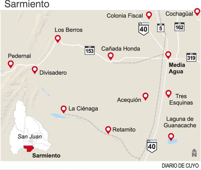 Entre los sitios sarmientinos podemos nombrar a Media Agua -la villa cabecera-, Colonia Fiscal, Cochagual, Las Lagunas, San Carlos, Cañada Honda, Los Berros, Pedernal, Divisadero Cienaguita, Guanacache y Retamito. El paisaje o la fisonomía física son intensamente atrayentes.