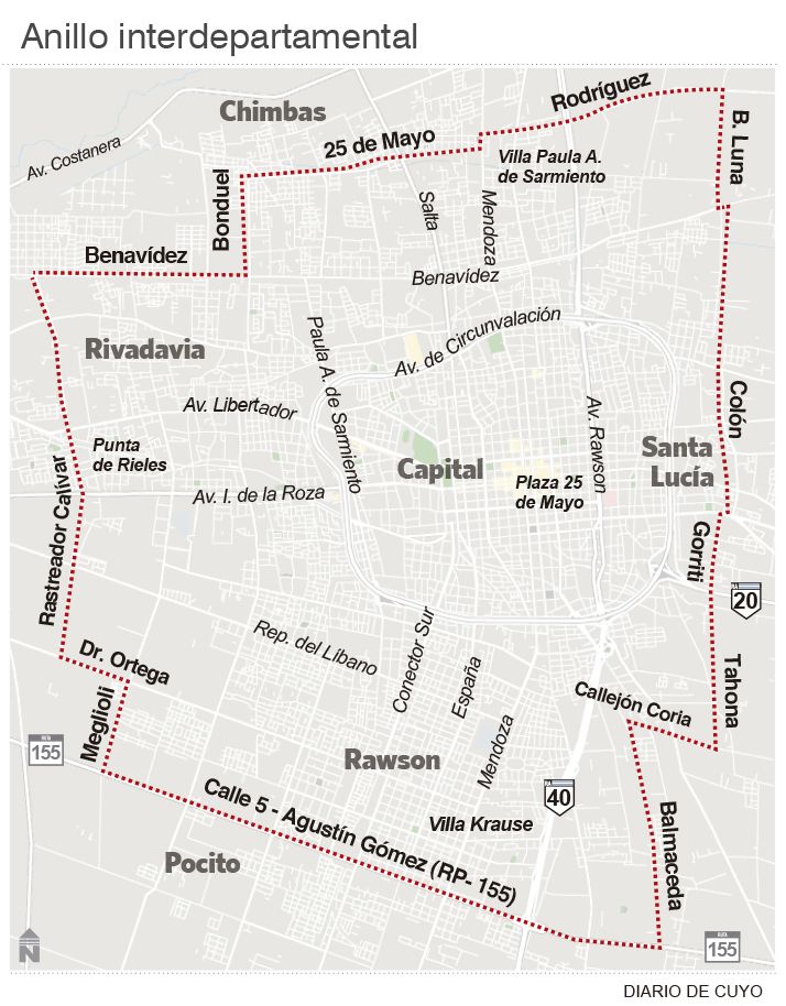 Algunas de las calles con mayores posibilidades de integrar este anillo vial y ser sometida a los trabajos de ensanche y acondicionamiento vial que incluirá mejoras en general como señalización, iluminación y parquización, contemplando también las reclamadas bicisendas, son: Calle 5, Agustín Gómez y Doctor Ortega, en Rawson; Colón, Gorriti y Buenventura Luna, en Santa Lucía; Rodríguez, Bondini y Benavidez, en Chimbas y Rastrador Calívar y Meglioli, en Rivadavia. Tampoco hay que olvidar algunas calles que conectan a departamentos como Rawson y Santa Lucía con Pocito, ya que si bien éste último no integra el Gran San Juan, por su proximidad y crecimiento demográfico y económico merece estar conectado para hacer más fluida la comunicación entre sus centros productivos y comerciales que han crecido considerablemente en estos últimos años.