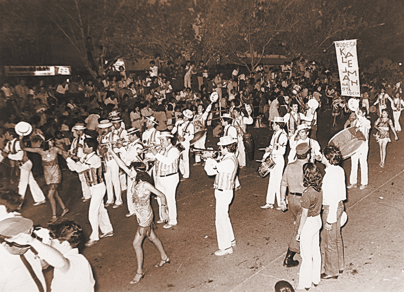 Con un taparrabos de lona viene Tarzán junto al gorila que se esmera en asustarnos y en el otro costado de la calle un boxeador que hace poco dejó los guantes desfila disfrazado de Cantinflas. Más atrás, otra comparsa que la gente ya arriesga ha de ganar el primer premio; prolija, numerosa, con un enorme estandarte negro calado de luces por sobre el autito que porta la batería que ilumina el grupo. Se me mete en el corazón como un clavel de fuego la murga de los millonarios, chicos de unos 10 a 15 años con trajes de bolsas de arpillera tachonados con tapitas de Bidú, Nora o cerveza San Juan y entre ellos voy yo a los saltos.