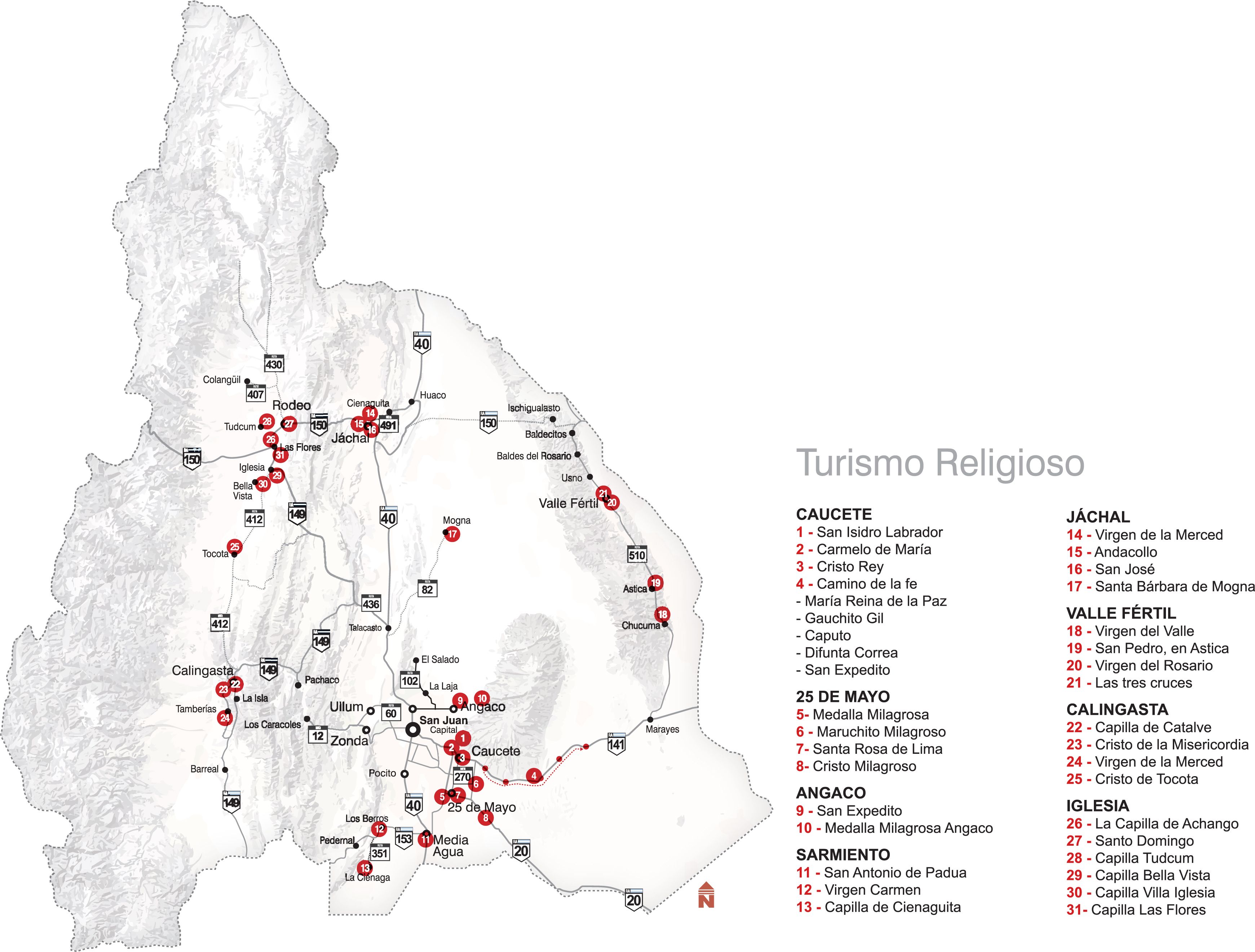 Entre estos departamentos se destaca el camino de la fe de Caucete y San Martín, al que dentro de muy poco se sumará Angaco. En Caucete se puede visitar por Ruta 20 el Santuario María Reina de la Paz, y después de empalmar con la ruta 510 el oratorio de Caputo, el paraje Difunta Correa y San Expedito. Se acaba de agregar la Capilla de San Isidro Labrador, en la Puntilla, el Convento Carmelo de María, en Villa Independencia, y la Iglesia Cristo Rey en la zona centro.