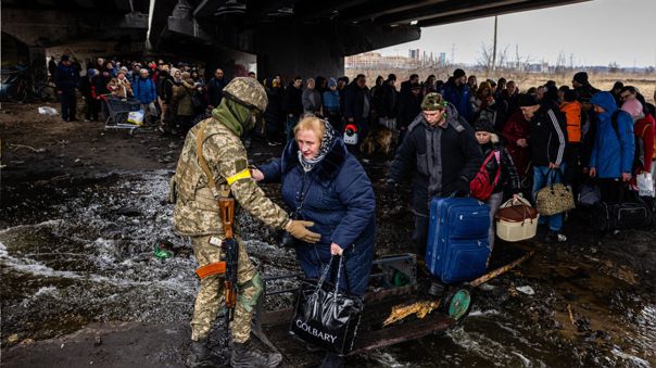 Ciudadanos ucranianos huyen ante los bombardeos y crímenes de guerra cometidos contra los civiles por parte de tropas rusas.