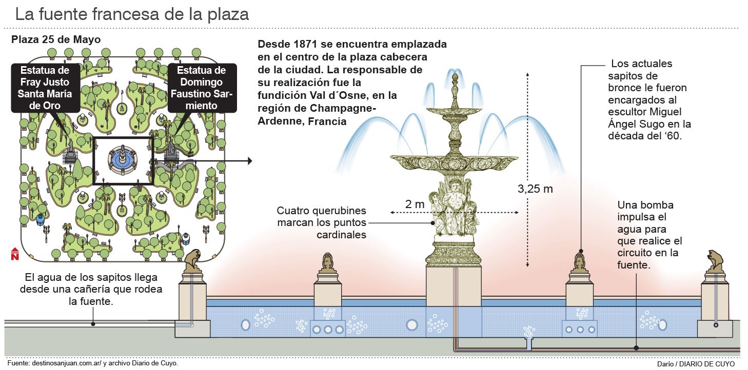 A su vez, los seis sapitos, también en restauración en estos momentos, si bien son considerados "los más llamativos y usados” de la fuente, no integraron el modelo original. De Francia llegó "el cuerpo central, los platos de agua y los cuatro querubines de apariencia renacentista que marcan los cuatro puntos cardinales de la provincia”, según explicó el arquitecto Jorge Cocinero presidente de ACCODEPAS, a un grupo de estudiantes de 4º año de la carrera de Arquitectura, que concurrieron a observar las obras de restauración que realiza la Municipalidad de la Capital en la plaza. Pero la novedad de la presencia del polifacético profesional Hugo Vinzio, escultor, pintor, muralista, ceramista y escritor, varias veces destacado en la sección Guía de DIARIO DE CUYO, en medio de esta recuperación del principal paseo público local, fue anunciada por el coordinador de Gabinete municipal, Sergio Mordacci, el secretario de Planificación Urbana, Cristian Hernández, técnicos de la empresa encargada de la restauración, y ACCODEPAS.