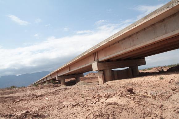 El puente que cruza sobre el Río Bermejo es el más largo de toda la traza de la Ruta 150. Sus 270 metros de extensión, más del triple del promedio de los restantes puentes que integran la megaobra, lo llevan a consolidarse actualmente como el segundo más largo de la provincia, sólo detrás del de Sorocayense, en el departamento Calingasta. Su función esencial es salvar el paso de la ruta internacional por el Río Bermejo, un afluente bastante complejo ya que posee mil metros de barranca, lo que motivó a realizar una estructura necesariamente extensa. Sin embargo, uno de los mayores retos en su construcción fue la necesidad de levantarlo por encima de los márgenes originalmente previstos debido a que la creciente del río aumenta por temporada y el componente de sólidos de arrastre sedimenta fuertemente en la zona debido a la baja pendiente.