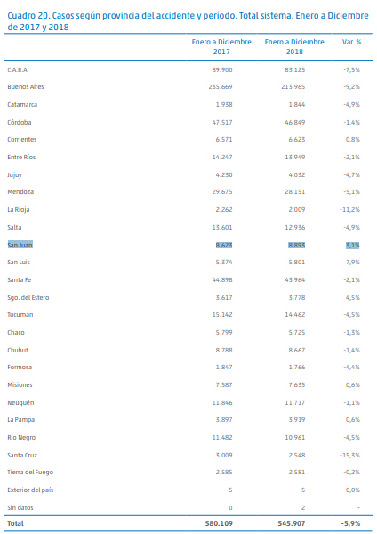 En este sentido, la Superintedencia de Riesgos de Trabajo dio a conocer un reciente informe sobre los siniestros en el ámbito laboral comparados los años 2017 y 2018. En el país, la cantidad de casos cayó un 5,9% mientras que en de San Juan tuvo un alza del 3,1%.