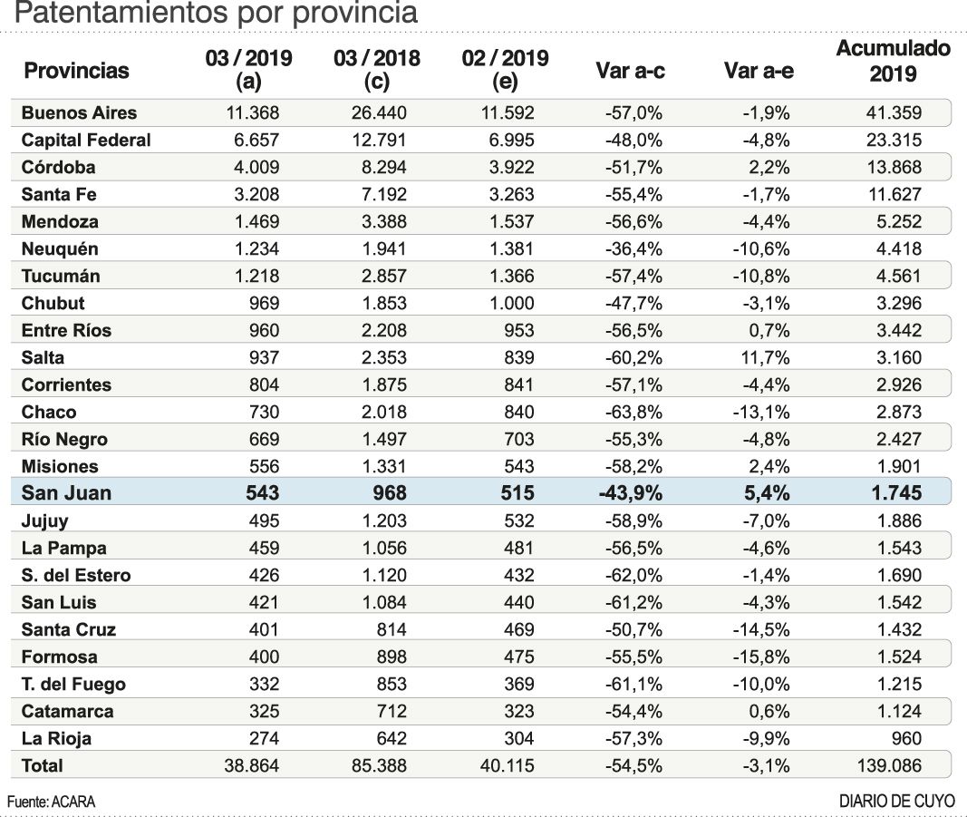 Después de una fuerte caída de los patentamientos de autos en febrero en la provincia, cuando se comercializaron 515 unidades, un 25% menos que el primer mes del año, en marzo hubo un rebote y se vendieron un total de 543 unidades, un 5,4% por encima del mes anterior. Este número ubica a San Juan en el segundo lugar del país en crecimiento de operaciones, en un ranking que lidera Salta, con una suba del 11,7%, según datos de la Asociación de Concesionarios de Automotores de la República Argentina (ACARA). La media nacional indica que hubo una retracción del 3,1% (ver infografía).