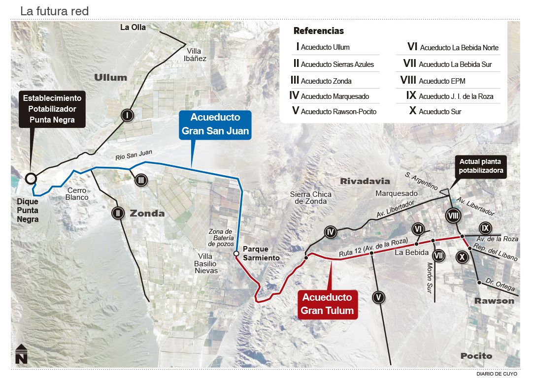 La obra es clave porque apunta a garantizar el suministro de agua potable que demandará la provincia dentro de unos 50 años. La gestión uñaquista modificó la iniciativa original, que data de 2013 y que llevaba el nombre de acueducto Gran Tulum, y se inclinó por el nuevo plan debido a que a través de acueductos menores se llegará a zonas que antes no estaban contempladas, como Ullum, Zonda, La Bebida y Marquesado, en Rivadavia, más áreas de Rawson y Pocito (Ver infografía). La modificación también se dio en el marco de los reclamos que venían realizando los vecinos zondinos, dado que el proyecto original contemplaba la extracción de las aguas subterráneas de Zonda. Los mismos sostenían que la reserva de agua dulce se iba a terminar secando si se extraía para ese fin, debido a que se quedó sin su principal fuente de recarga por la construcción de un canal impermeabilizado que se hizo del río San Juan en la zona del dique Punta Negra. El otro argumento que esgrimían era que las aguas subterráneas se han visto afectadas por los pozos negros del departamento. Para sanear la zona, el Gobierno también instalará una red cloacal.