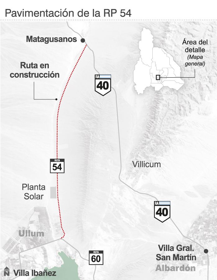 Los trabajos empezaron en enero y avanzan a buen ritmo, con la vista puesta en tenerlos finalizados a fines del 2020. Se trata de la Ruta Provincial Nro. 54, conocida como el camino a Matagusanos, que une los departamentos Ullum y Albardón. En su trayecto pasa por la zona de las plantas solares, una que ya está en funcionamiento, pero hay otras en construcción, además de dar acceso a la futura cárcel de la provincia y también sirve como alternativa de comunicación con el nuevo autódromo con el que cuenta San Juan, ubicado en la zona del Villicum.