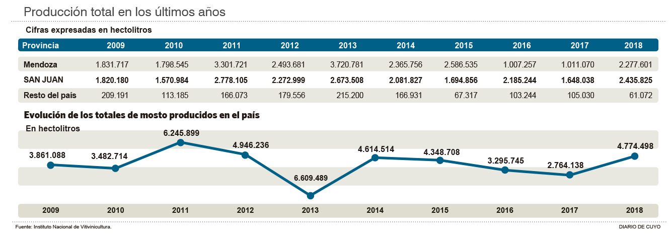 Según datos oficiales, durante la cosecha 2018, San Juan destinó el 47,3% de su producción de uvas a la elaboración de mosto. Ese mismo año, la provincia exportó 49.237 toneladas de este producto vitivinícola.