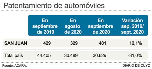 En lo que va del año la venta de autos 0km en esta provincia vino registrando cifras negativas comparadas con el 2019, que se revirtieron en septiembre: el mes pasado en las concesionarias sanjuaninas se patentaron 481 vehículos, lo que significó un 12% más que las 429 unidades del mismo mes del año pasado, según cifras difundidas por Asociación de Concesionarios de Automotores de la República Argentina (ACARA). Para Javier Fornasari, representante de ACARA en San Juan, el repunte responde a dos factores. Por un lado, que se sumaron operaciones que provenían de agosto, mes en que esta provincia estuvo en Fase 1 por un brote de Covid y las concesionarias estuvieron cerradas unos 10 días. En segundo lugar, por las variaciones del dólar blue, que incentivaron la concurrencia de publico a los salones. ""Apenas sube el dólar paralelo se nota una mayor afluencia de público a las concesionarias. Hay una sensación de que puede haber una devaluación, o subir los precios considerablemente, y ante ese temor, los pesos queman en las manos y ven la forma de acceder rápido a un bien tangible como es un auto", dijo Fornasari. Agregó que la gente ha visto una oportunidad de comprar el 0km ante la sensación de incertidumbre. No obstante, consideró que el repunte no alcanza, porque este año se estima que se terminara vendiendo la mitad del año pasado.