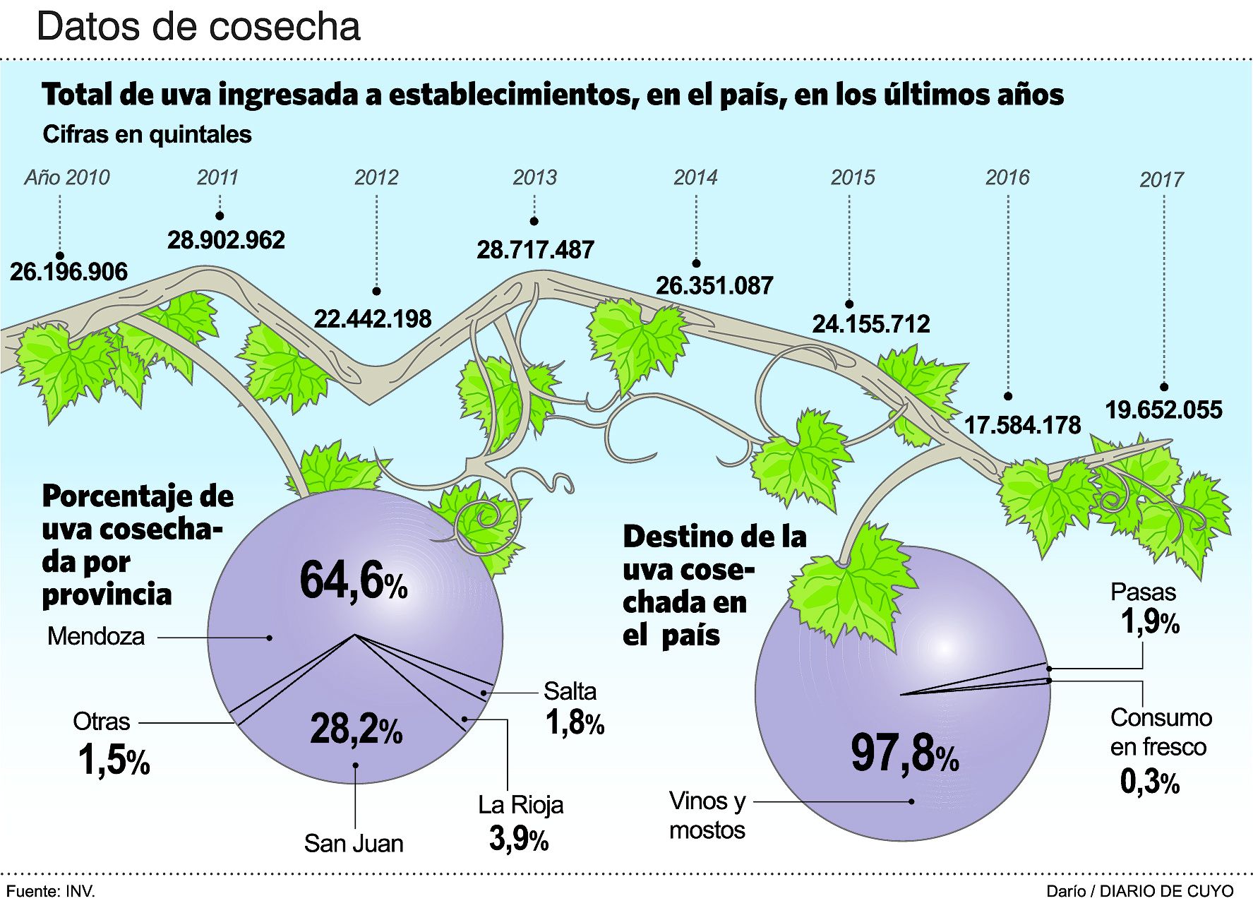 En uvas comunes hay sintonía porque todos piensan que este año la producción se recuperará y obtendrá valores superiores a los del 2017 pese a los daños de enfermedades asociadas al clima. Pero con las uvas tintas es diferente: mientras las cámaras viñateras advierten que habrá merma -hablan de bajas que van del 5 al 30 por ciento-, en el Gobierno sostienen que toda la producción de uvas de esta temporada será mayor que la pasada. Todos estos contrastes suceden a un día de que el Instituto Nacional de Vitivinicultura (INV) difunda la que este año será la primera y única estimación de cosecha vitivinícola, dato que es usado para planear los precios de la temporada. Mañana a las 11 en la sede del INV en Mendoza se dará a conocer el resultado del pronóstico técnico.
