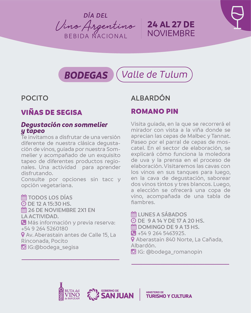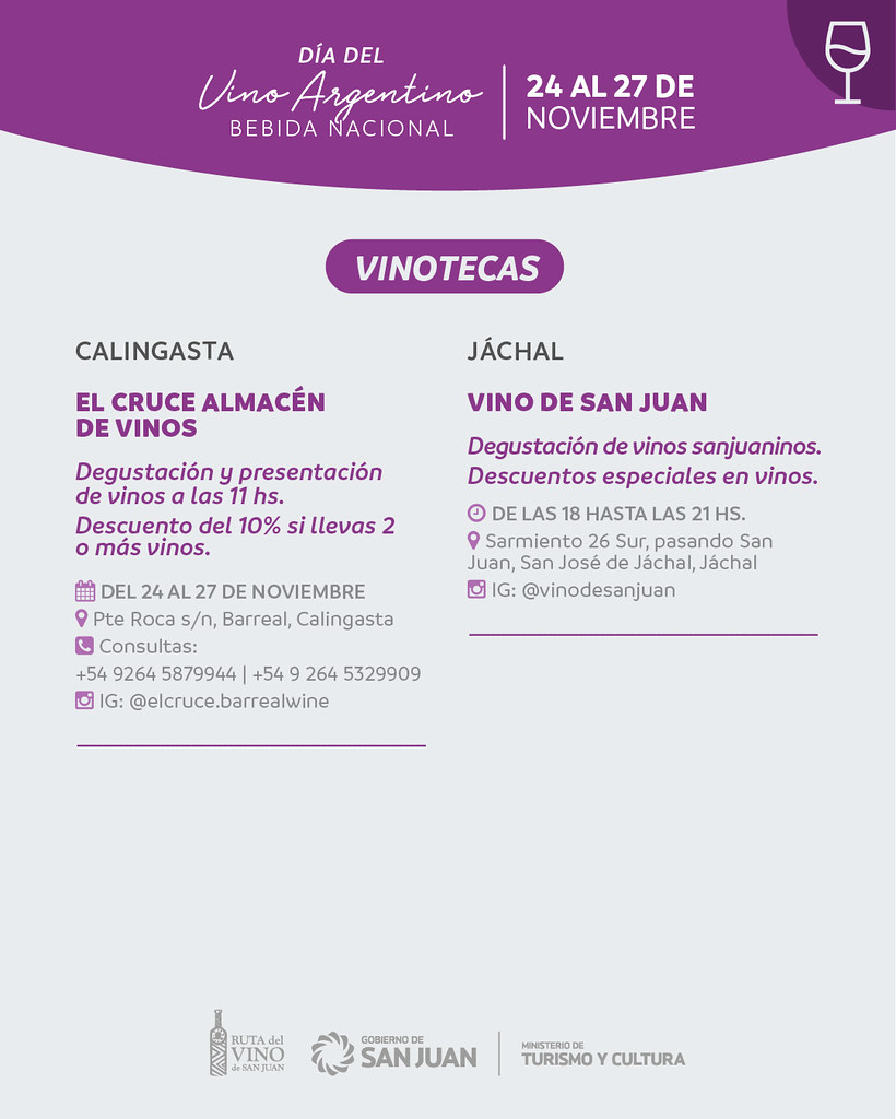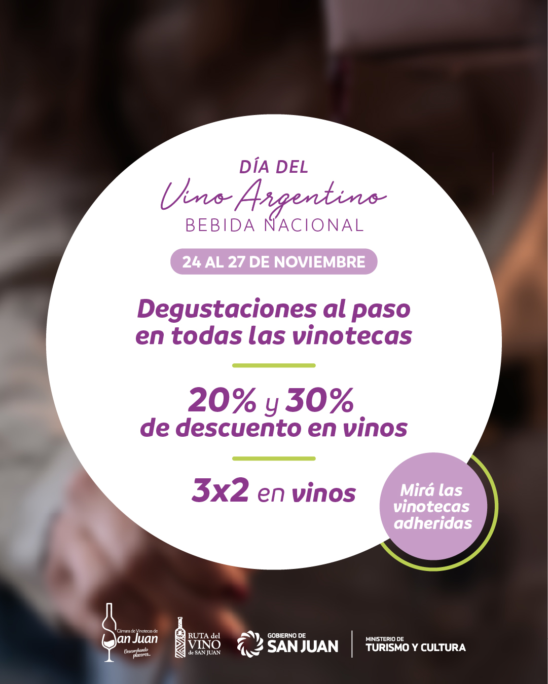 Este jueves 24 de noviembre se celebra el Día del Vino Argentino en todo el país. En nuestra provincia, la Asociación Empresarial Hotelera Gastronómica de San Juan; la Cámara de Vinotecas y las bodegas, en su totalidad de la Ruta del Vino de San Juan, tienen planeadas una serie de actividades que se extenderán hasta el 27 de noviembre.