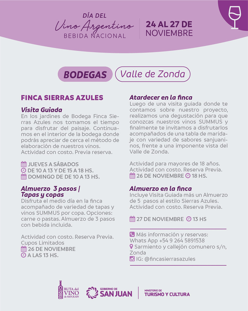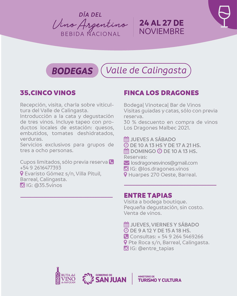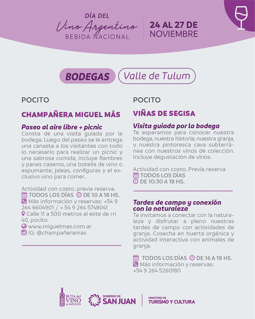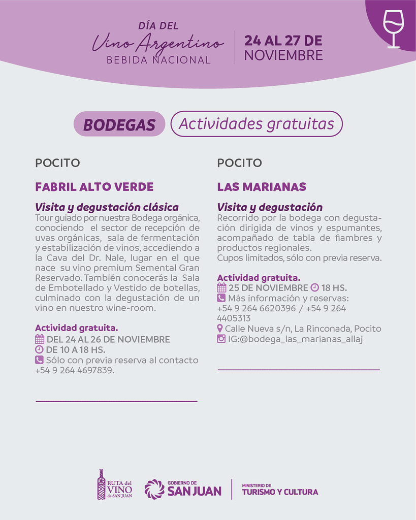 Este jueves 24 de noviembre se celebra el Día del Vino Argentino en todo el país. En nuestra provincia, la Asociación Empresarial Hotelera Gastronómica de San Juan; la Cámara de Vinotecas y las bodegas, en su totalidad de la Ruta del Vino de San Juan, tienen planeadas una serie de actividades que se extenderán hasta el 27 de noviembre.