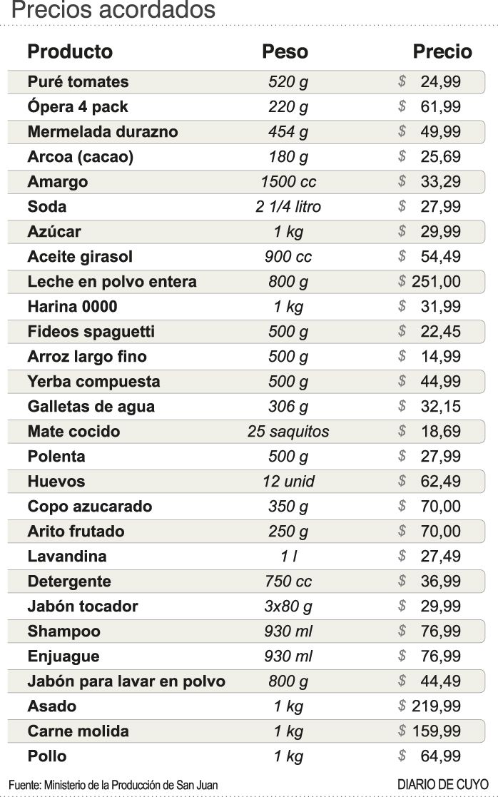 El acuerdo será formalizado hoy, a las 9,30, en la sala de reuniones del Ministerio de la Producción, con la presencia del titular del área, Andrés Díaz Cano, y la participación de los comerciantes nucleados en la Cámara Sanjuanina de Supermercados y Autoservicios (Cassa), además de representantes de las carnicerías y de las avícolas. Y entrará en vigencia en forma inmediata.