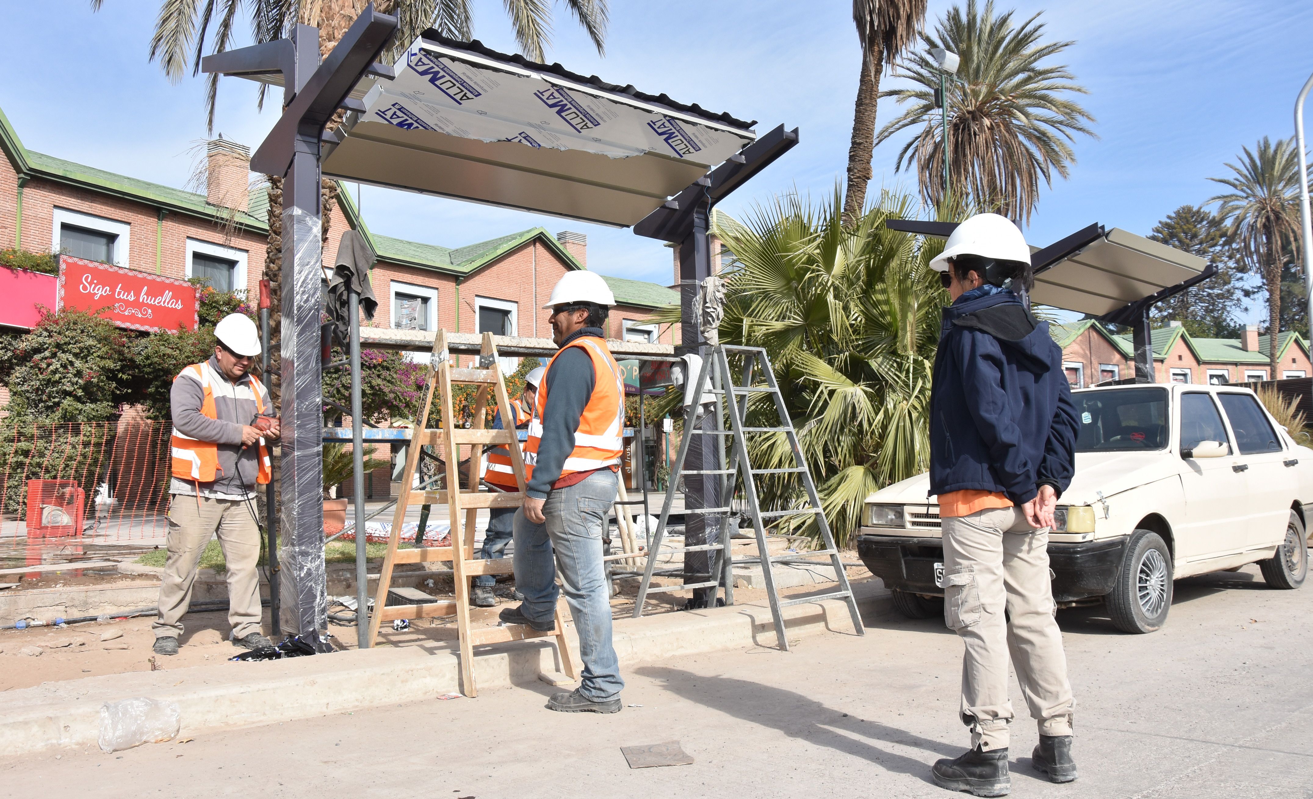 Tareas. Por estos días el personal de la empresa encargada de las tareas trabaja en el montaje de las paradas de colectivos, que tendrán tomas para cargar los celulares.