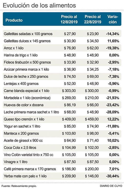 Aunque se esperaba un incremento generalizado de los valores de los productos, un relevamiento de precios de 21 artículos de la canasta familiar, en el que se tuvieron en cuenta los valores del lunes 12 de agosto, el día después de las PASO que provocó la corrida del dólar y una fuerte devaluación de la moneda, con otro realizado ayer, a los 10 días del primero, arrojó que 14 productos bajaron sus precios. La razón, según opinaron en el sector de supermercados locales, es la incidencia de la eliminación del IVA en alimentos que integran la canasta básica.