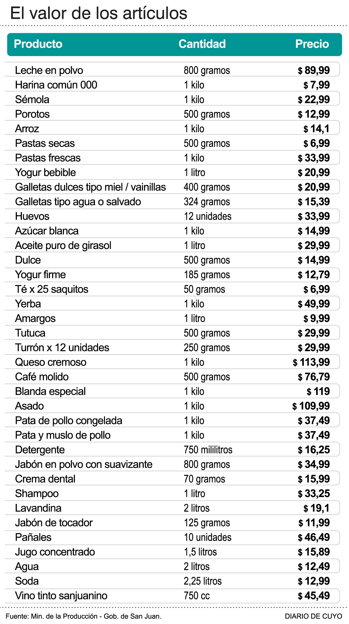 Del balance surge que hubo 9 artículos que subieron sus precios, un 18% en promedio y la mayoría lácteos. Como contrapartida, 17 de ellos bajaron sus valores, un 13% en promedio. Entre estos últimos se trata, por ejemplo, de harinas, sémola, porotos, arroz y galletas. En tanto, otros 7 alimentos no registraron variaciones, como en los casos de galletas, carnes y pollo. Una novedad es que para el mes de abril se sumaron al listado por primera vez 4 bebidas: jugo concentrado, agua embotellada, soda y vino tinto sanjuanino.
