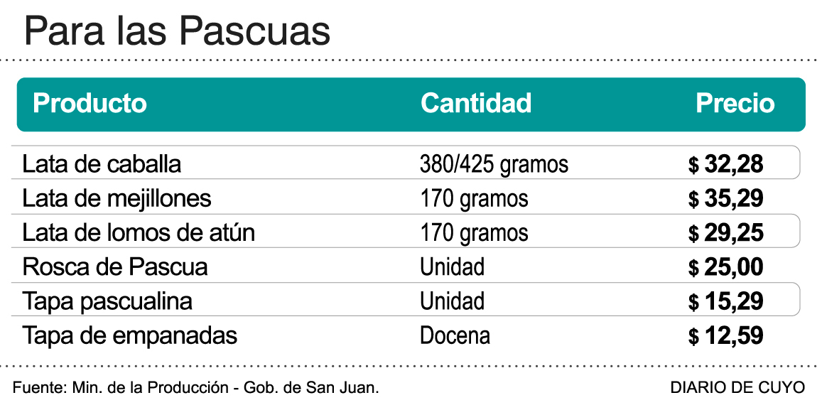 Con la Pascua que marca la culminación de la Cuaresma cada vez más cerca, el Gobierno provincial decidió incorporar al plan Precios Acordados 6 artículos relacionados a la celebración religiosa, además de prorrogar hasta el 30 de abril el programa que inicialmente vencía ayer. La decisión fue para ofrecer precios convenientes al público sanjuanino, ahora con productos comestibles que se utilizan en la preparación de platos de alto consumo en Semana Santa tales como caballa, mejillones, lomos de atún, masas para tartas y empanadas y la tradicional rosca.
