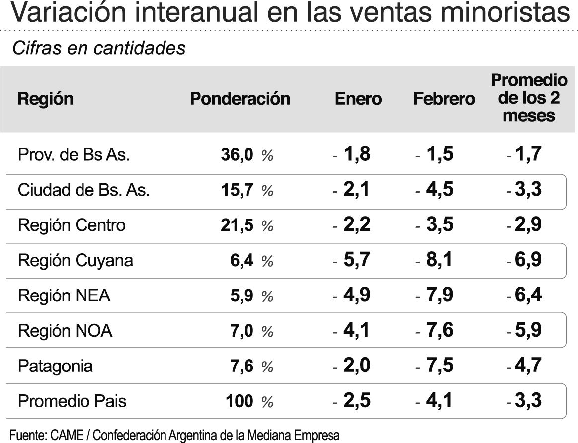 En la provincia de Buenos Aires, en tanto, con más heterogeneidad, la baja anual promedio del mes fue de 1,5%. En San Juan, las ventas minoristas de enero cayeron 8,4% y las de febrero 3,8%, acumulando un promedio de baja del 6,1% en los dos meses.