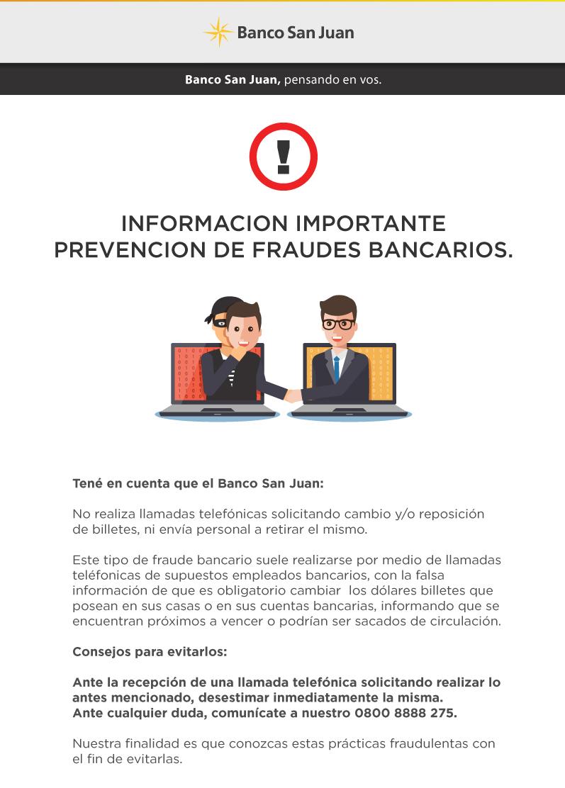 Y aclararon que “Banco San Juan no realiza llamadas telefónicas solicitando cambio y/o reposición de billetes ni envía personal a retirar los mismos”.