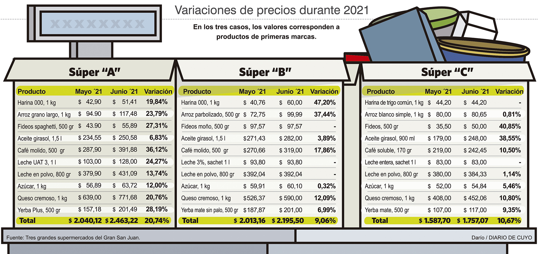 En el último mes, los precios de 10 productos de la canasta de alimentos de primeras marcas volvieron a tener una fuerte escalada en las góndolas sanjuaninas, al sufrir incrementos promedio del 13,4% respecto a lo que valían en mayo, con picos de entre el 9% y el 20,7% en los diferentes locales, según reveló un sondeo realizado por DIARIO DE CUYO en tres supermercados líderes de la provincia. El sondeo es sin mencionar el nombre del punto de venta, pero se trata de cadenas con precios de venta minorista. El incremento de los valores de esa decena de productos le gana por goleada al promedio del índice general de inflación que viene creciendo a un promedio del 3 al 4 por ciento mensual. En mayo, la inflación nacional fue de 3,3%, según reveló el INDEC hace unos días (ver aparte), y consultoras nacionales ya registran que para junio rondará un número similar. Claro que para obtener ese índice de inflación se calculan los valores de un centenar de productos, bienes y servicios, y por eso al promediar, el valor resultante es menor. Pero cualquier cliente que vaya cada tanto al supermercado advierte que el alza en los alimentos es incesante, y cuando se lo compara de un mes a otro, resulta impactante comprobar que el dinero alcanza cada vez menos: hay casos como el precio de medio kilo de café molido que en un mismo local aumentó 36% desde el mes pasado a ayer, y la bolsita de una marca conocida ya roza 400 pesos. O el aceite que en idéntica superficie se incrementó el mismo litro, de la misma marca, a 248 pesos; es decir, un 38,55% frente a los 179 pesos que costaba en mayo. Para esta nota, además de los mencionados anteriormente, se relevaron también los precios de la harina, arroz, fideos, leche liquida, leche en polvo, azúcar, queso cremoso y yerba.