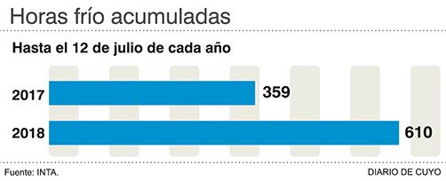 De acuerdo a los datos suministrados por el Servicio de Agrometeorología de la Estación Experimental Agropecuaria San Juan del INTA, en Pocito, al 12 de julio se han registrado 610 horas/frío, cuando en el mismo lapso del año pasado sólo llevaban 359. Como se observa, la situación es mucho mejor que el invierno pasado, superando actualmente en un 70% la acumulación de horas frío respecto al 2017. Las horas frío son una medición donde se computan las temperaturas iguales o inferiores a 7 grados, y representan un requerimiento natural de las plantas para tener una adecuada floración y brotación, y garantizar, por lo tanto, un mayor volumen de producción para la cosecha en la época estival. Arturo Pechuán, desde INTA San Juan, informó sobre la "dosis" de frío que necesita aproximadamente cada cultivo: 500 horas frío promedio para los almendros, 800 a 1.000 horas para los pistachos y entre 600 y 800 horas para los olivos, dependiendo de las zonas y la variedad. Rodrigo Espindola, desde el INTA Caucete, informó que los viñedos requieren entre 200 y 500 horas con temperaturas por debajo de los 10 grados Celsius, también dependiendo de la zona y variedades. Otros frutales como el durazno precisan entre 50 y 1.200 horas frío.