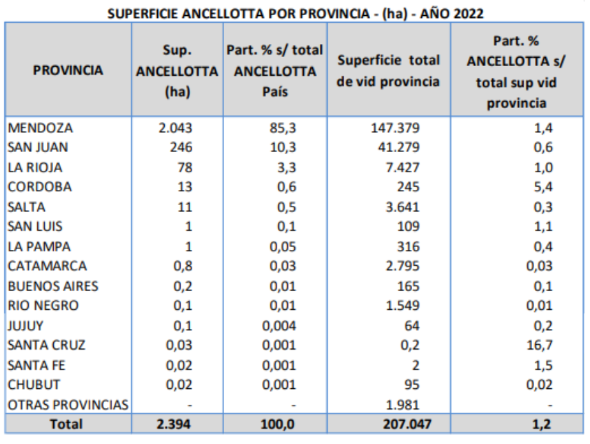 La cantidad de hectáreas en el país ha aumentado un 345,7% en el período 2013-2022, ocupando el segundo lugar entre las variedades que más aumentan, luego de Malbec. En Mendoza aumentó un 407,9%, en San Juan un 105,4% y en el resto del país un 585%. La provincia de Mendoza tiene la mayor cantidad de Ancellotta del país, alcanzando en 2022 las 2.043 ha (85,3%), seguida por San Juan con 246 ha (10,3%) y el resto de las provincias con 106 ha (4.4%).