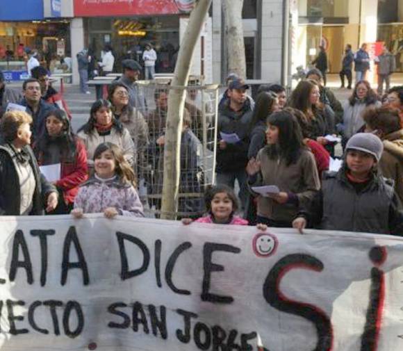 Alrededor de 50 personas portando pancartas, recorrieron el microcentro mendocino para expresar el apoyo de una parte del pueblo de Uspallata a la minera San Jorge, que en los últimos días ‘coqueteó‘ con trabajar en San Juan.