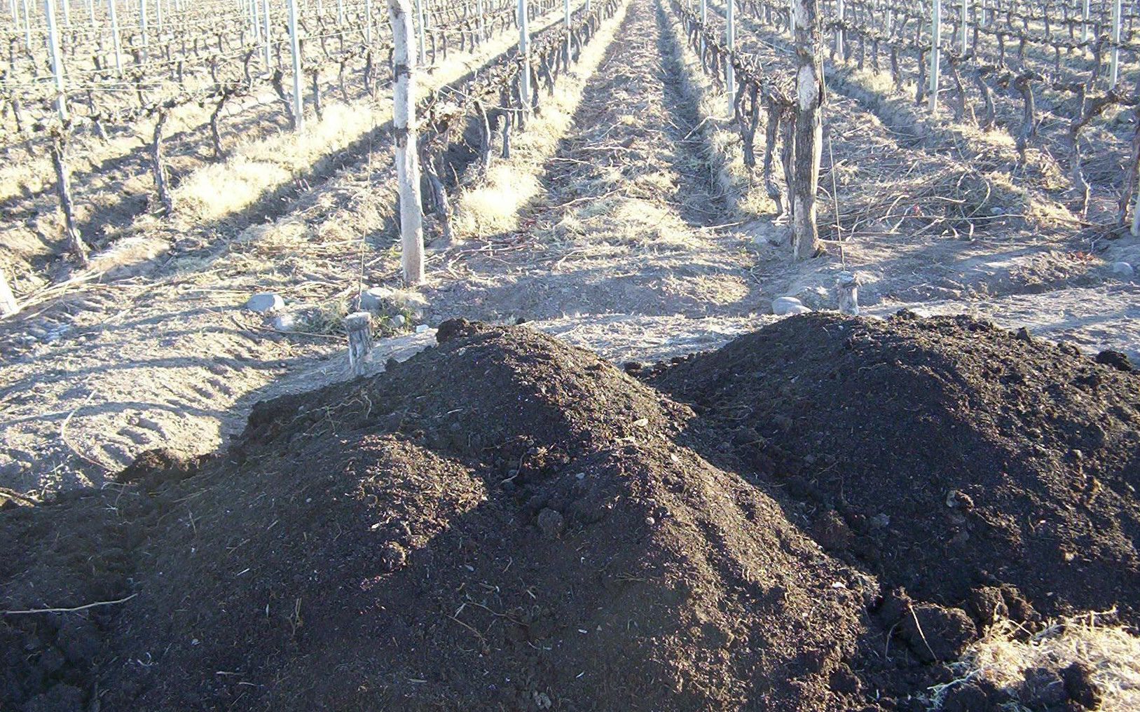 La aplicación al suelo de orujo fresco en agosto a razón de 20 toneladas por hectárea genera una acción física porque mejora la estructura del suelo al darle mayor porosidad, una acción química por su alto contenido de sustancias benéficas provenientes de la uva, mejora la producción de saprofitos (se alimentan de nemátodes), la producción de hongos parásitos de nemátodes e incrementa la producción de raíces. Todo ello lleva a mejorar los rindes de uva por hectárea. Este orujo volcado en callejones (algo ya fermentado) se incorpora directamente al suelo. Una aplicación integrada a razón de orujo fresco y Fenamifos (16 litros por hectárea) con 10 centímetros de brote en un año y una segunda aplicación de orujo fresco en la segunda temporada dio muy buenos resultados también. Queda claro que el orujo agotado proveniente de destilería no tiene este efecto.